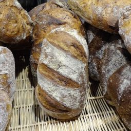 Pain demi-gris élaboré avec de la farine de blé écrasé sur une meule en pierre et au levain naturel. C'est un pain avec une mie légère et une croute épaisse bien grillée. C'est le pain où le levain se fait le plus sentir. Il accompagne à merveille vos plats en sauces, les fromages et la charcuterie.