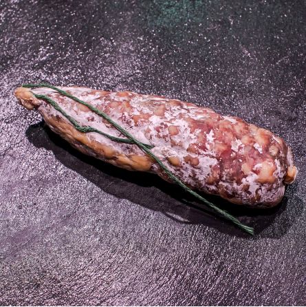 La notion "pur porc" n'est pas que du marketing: c'est un gage de qualité que tant la viande hâchée que le gras du saucisson viennent de morceaux finement sélectionnés et uniquement de porc. Avec des morceaux entiers de noisettes pour croquer sous la dent!